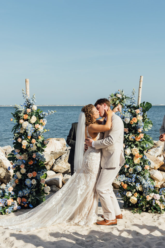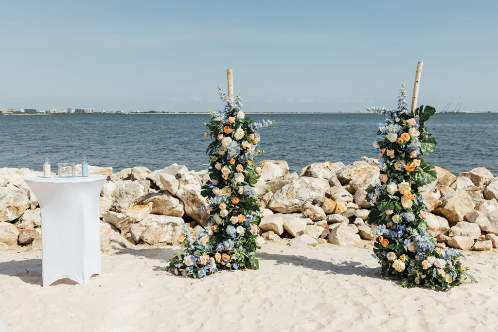 Set on the edge of Rocky Point, The CURRENT Hotel offers unmatched waterfront views with a sleek, modern vibe. Their ceremony took place on the hotel’s private beach, where soft white sand met the calm bay waters, creating a peaceful and romantic atmosphere as they exchanged their vows beneath vibrant florals.