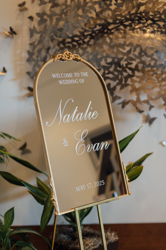 Love Note From the Couple: “Prior to our wedding, Marykate helped us create the perfect wedding day timeline. She reviewed vendor contracts and provided helpful feedback. Later on, she worked behind-the-scenes to introduce herself and provide vendor timelines to each of our vendors. Additionally, she created both our beautiful welcome sign and seating chart!”Charming details were tied in throughout the ceremony, highlighting important parts of their lives that lead them to one another.The couple slipped outside to savor a quiet moment beneath the golden sky and gaze at the sunset behind them.