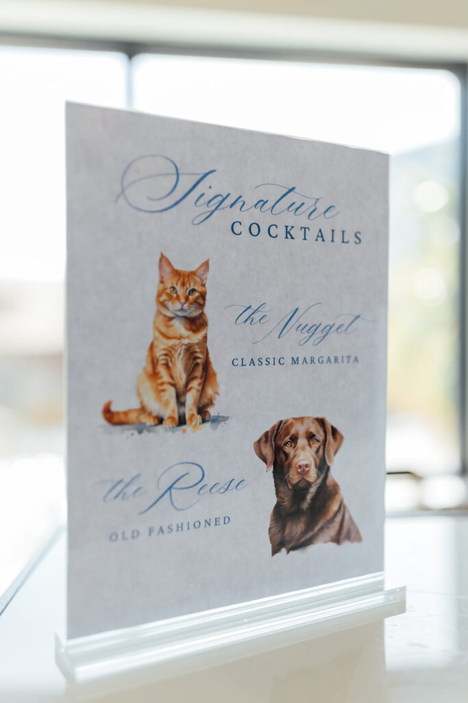 After the ceremony, guests sipped on the sweetest signature cocktails named after Natalie and Evan’s beloved pups (we couldn’t get enough of this personal touch!). The reception space was absolutely breathtaking, with floor-to-ceiling windows overlooking the bay and pops of soft blue woven into the crisp white linens. A subtle nod to the ocean that inspired their day.