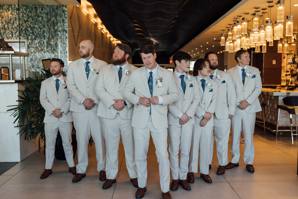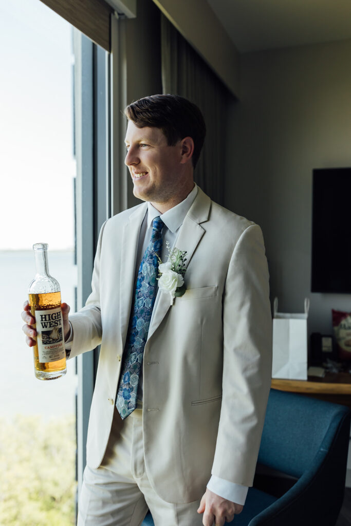 A few doors down, Evan shared a quiet moment by the window to take in the view, the day, and the life he was about to build with Natalie. His crew kept things easy and light by tying ties, sharing a few laughs, and making sure Evan had everything he needed (including a solid glass before heading out).